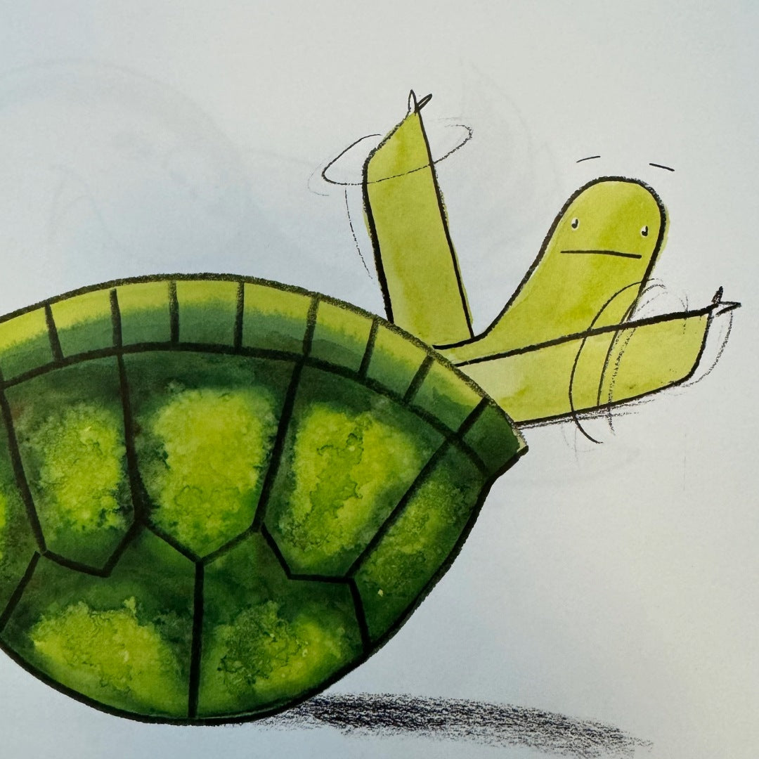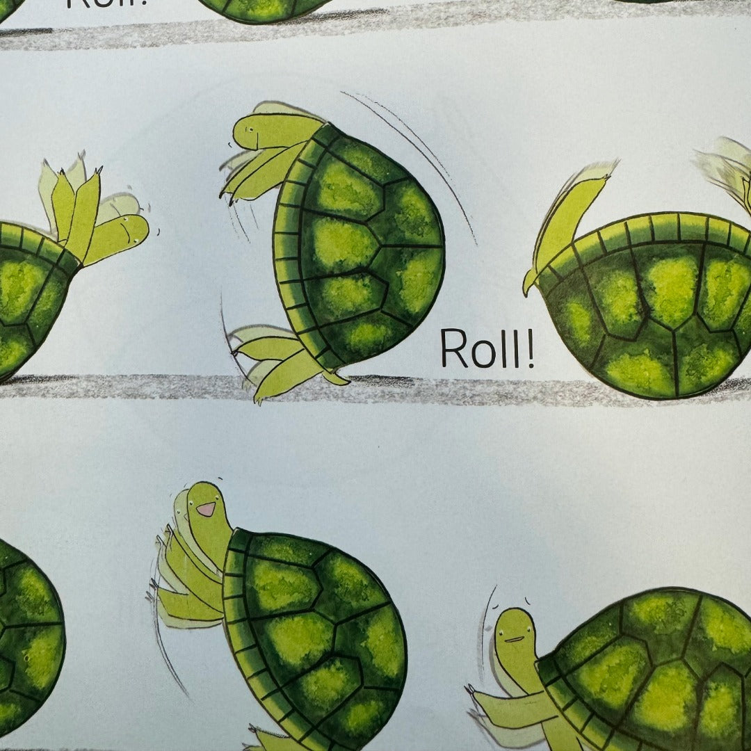 “Stuck?” asks Duck. Yep, Turtle is flipped over on his shell and can’t seem to get un-stuck. Duck suggests wiggling his feet, Kangaroo wants him to wag his tail, and Armadillo says rolling into a ball always does the trick. But Turtle is STILL. STUCK.