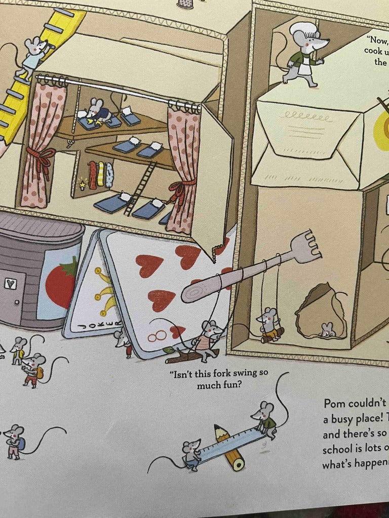 Pom is ready for the first day of kindergarten. Not the real first day, that’s not for another year. But Pom has been hearing a lot from all the animals about each of their schools. So today Pom is visiting them all, to see what kindergarten is really like. Pom starts by watching the mouselings ride the bird bus; then the rabbits learning to read, write and count; the froglets making art; the foxes playing sports; the bear cubs sharing lunch; the sloths napping; the squirrels exploring nature; the wolf pups reading stories; the turtles doing classroom tasks; and, finally, the hedgehogs waiting to be picked up in the schoolyard. Pom is thrilled to discover there are so many fun activities to enjoy at school! Best of all, now Pom knows what Pom wants to do in kindergarten — all of it!