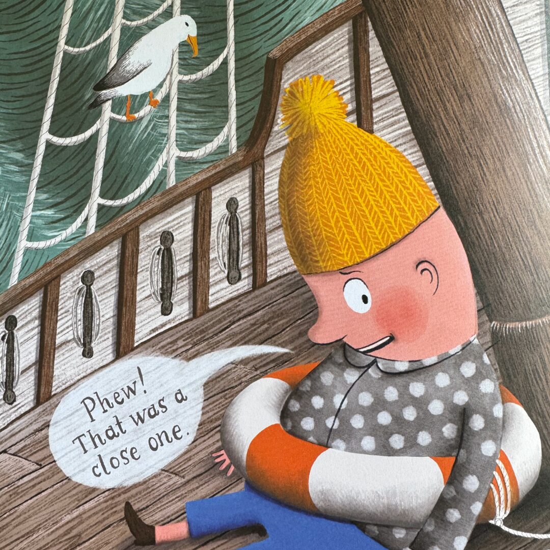There's a storm coming, and a child is ready to captain the ship. "Make haste and climb aboard," they call out to their parent, "before you're swept out to sea!"